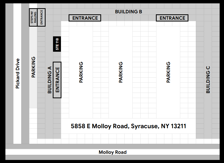 Use the building map to find the studio in the back left of the building. Located in Building A, Suite 118.